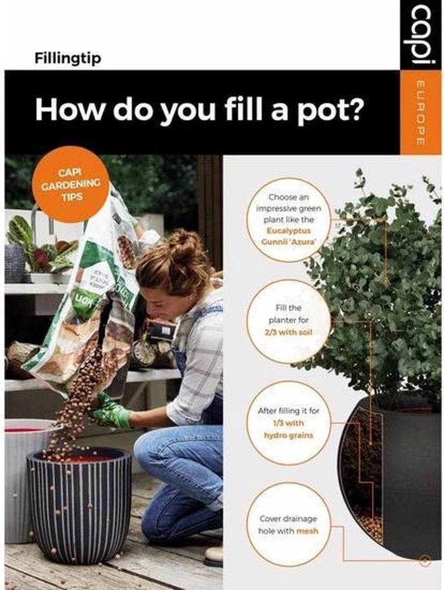 De bloempot is 100% waterdicht en daardoor perfect geschikt om binnen te gebruiken. Wil je de bloempot buiten gebruiken, zorg dan dat je een afwateringsgat van minimaal 25 mm in de bodem boort.