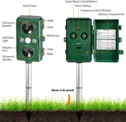 Het apparaat beschikt over een infrarood bewegingssensor die de beweging en lichaamswarmte van een dier dat in de buurt komt waarneemt. Vervolgens geeft het apparaat een geluid, ultrasone golf en/of lichtflits af, wat het dier afschrikt en wegjaagt. Het apparaat heeft meerdere frequenties die u kunt instellen om zelf te bepalen welke diersoorten u uit uw tuin wilt verjagen.