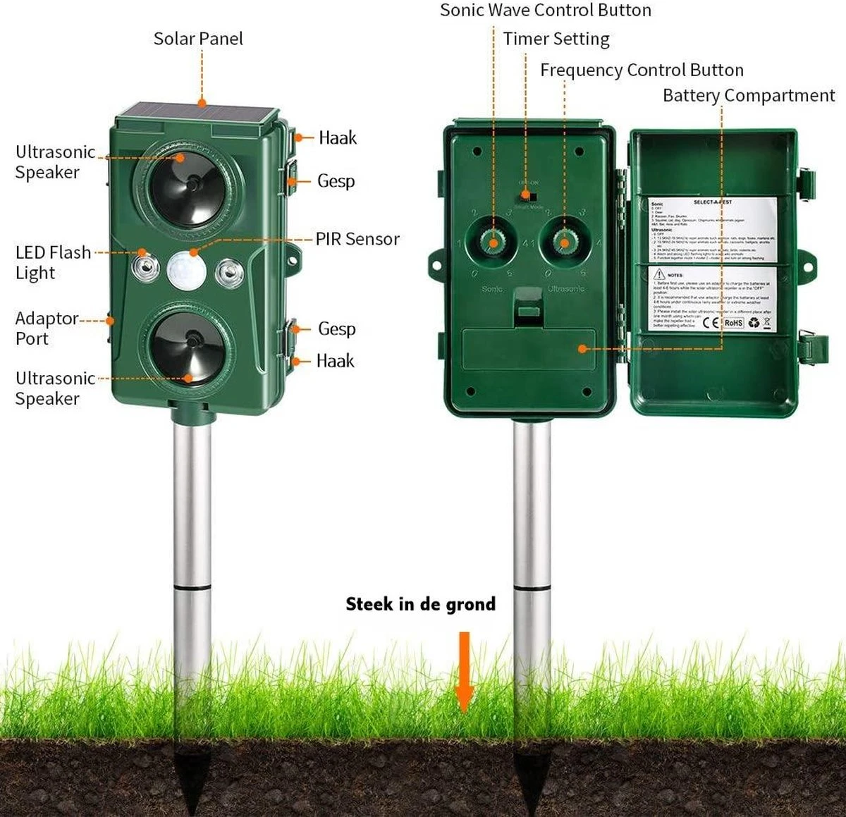 Niet schadelijk voor zowel mensen als dieren. Dieren worden afgeschrikt door de ultrasone golven, het sonar geluid en de lichtflits, maar zullen geen pijn ervaren.