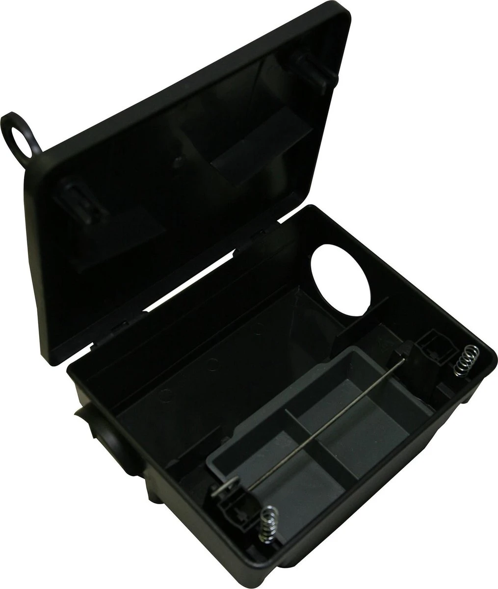 Compact and strong rat food box with double lock to explain baits more safely and efficiently. Made from sturdy plastic for all possible baits (grains, blocks and pasta). Also has a skewer to attach the pastes and blocks.