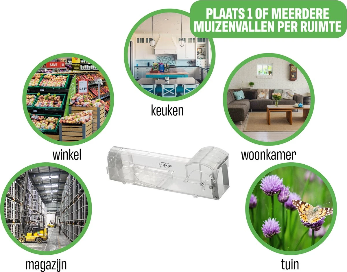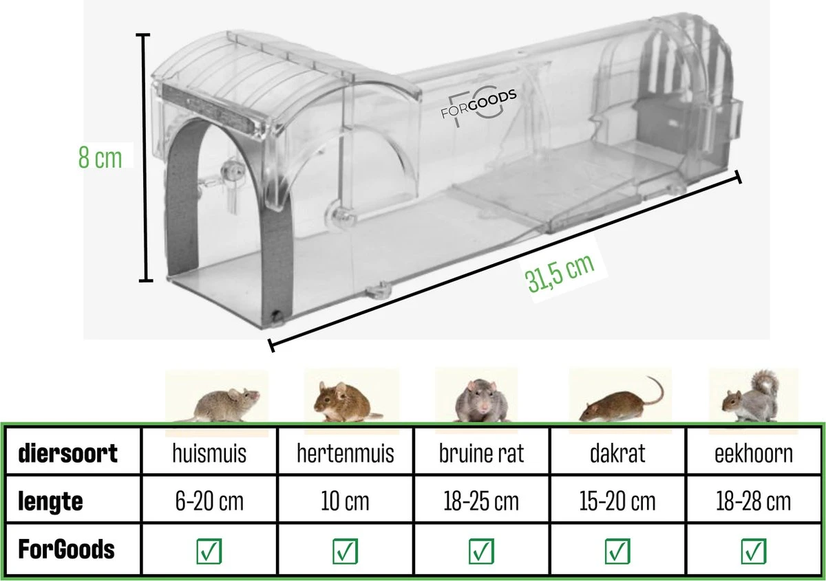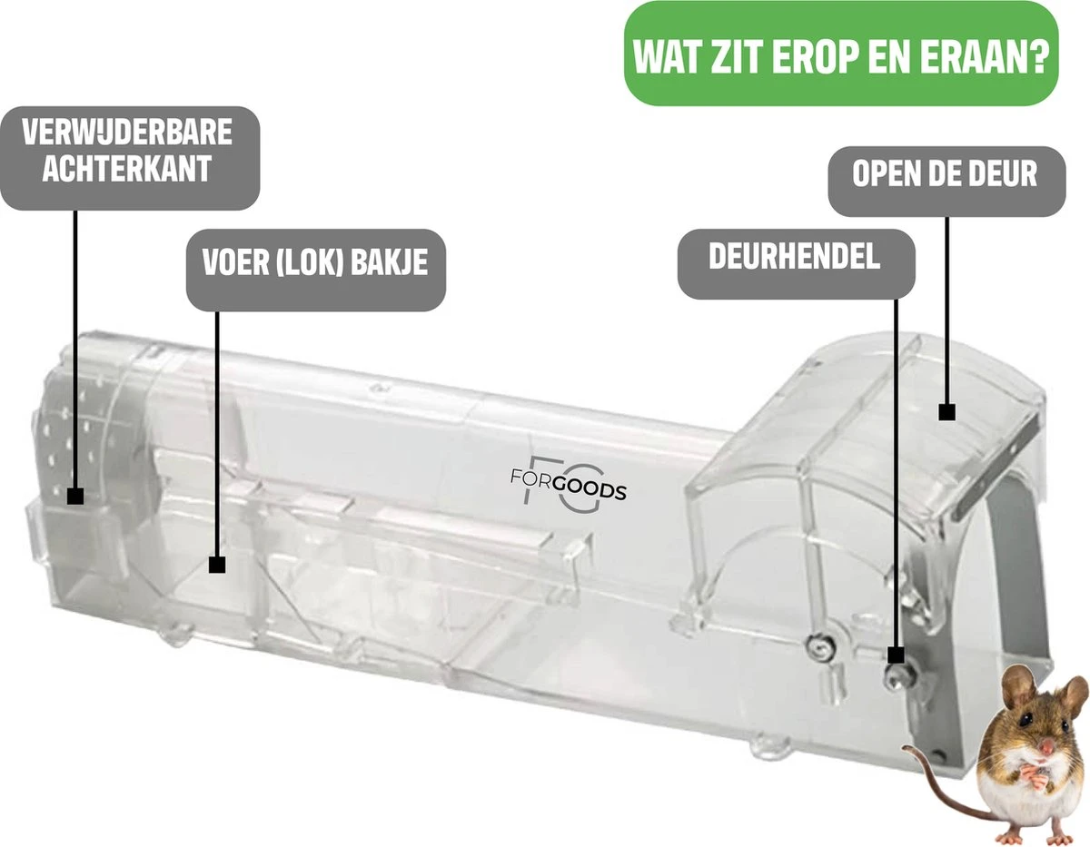 Met deze muizenval van Forgoods vang je de muizen/ratten levend door een beetje aas in de val te leggen. Als aas kan je bijvoorbeeld: leverworst, kaas, chocopasta of pindakaas gebruiken. Je plaatst de val op een plek waar je de muizen of ratten hebt zien lopen of waar de meeste uitwerpselen liggen. Het is verstandig om de muizenval tegen een muur aan te zetten, omdat muizen/ratten hier graag langs lopen. Als het ongedierte in de val is gelopen, is ontsnappen niet meer mogelijk. Zonder het diertje aan te raken laat je de gevangen muis of rat gemakkelijk weer los in de natuur. Nadat je de muis of rat hebt gevangen en vrijgelaten, spoel je de muizenval gemakkelijk schoon met water en maak je de val met wat aas gereed om de volgende muis of rat te vangen. Bij het signaleren van meerdere muizen in huis, adviseren wij om meerdere muizenvallen te plaatsen