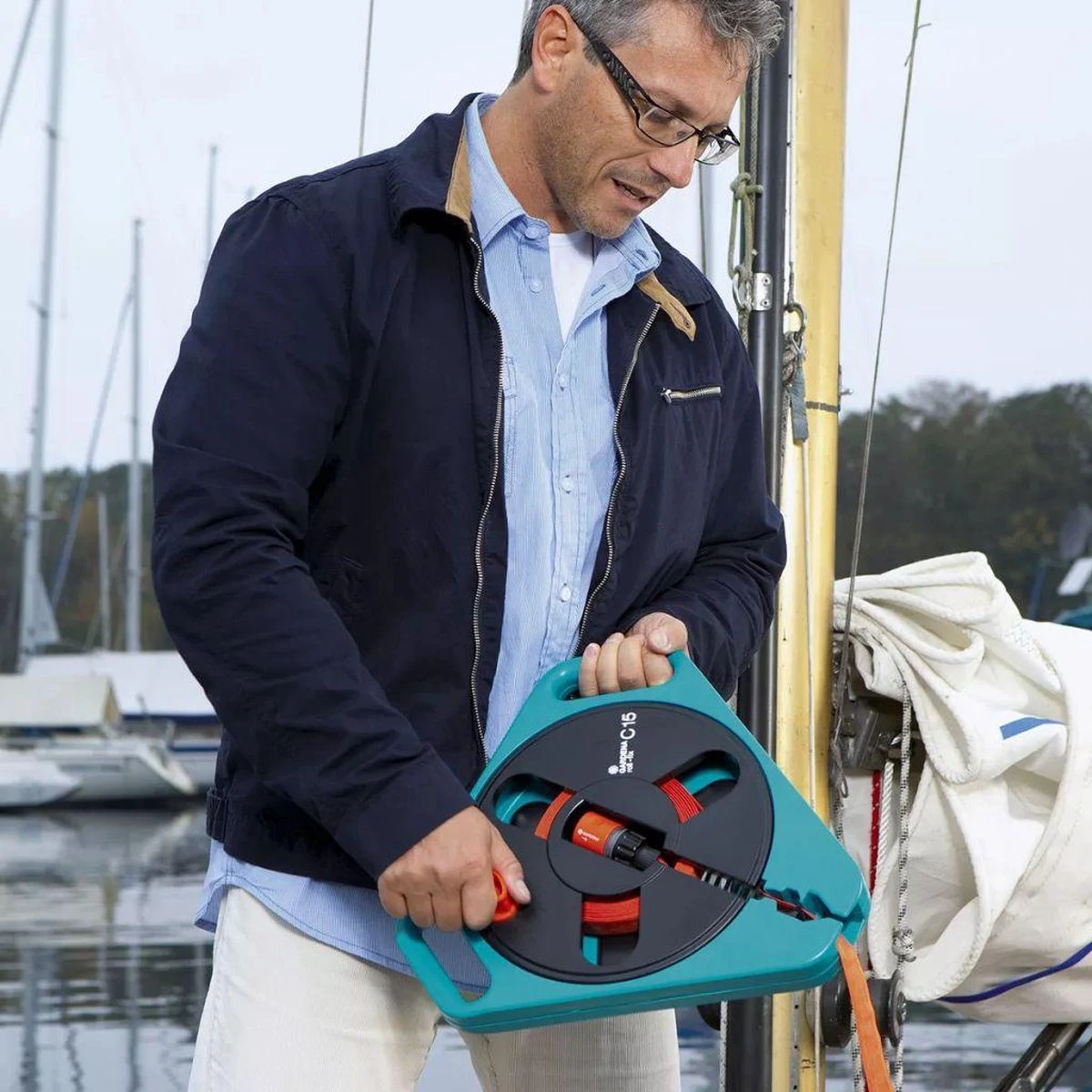 Gardena roll-fix, 15 m platte slang in cassette Licht en compact. Geïmpregneerde platte slang. Met veiligheids automaat die voorkomt dat bij het onopzettelijk onder druk zetten van de nog niet afgerolde slang, de draagcassette stuk gaat. Barstdruk boven 25 bar. Compleet met Original Gardena System aansluitstukken en tuinspuit.