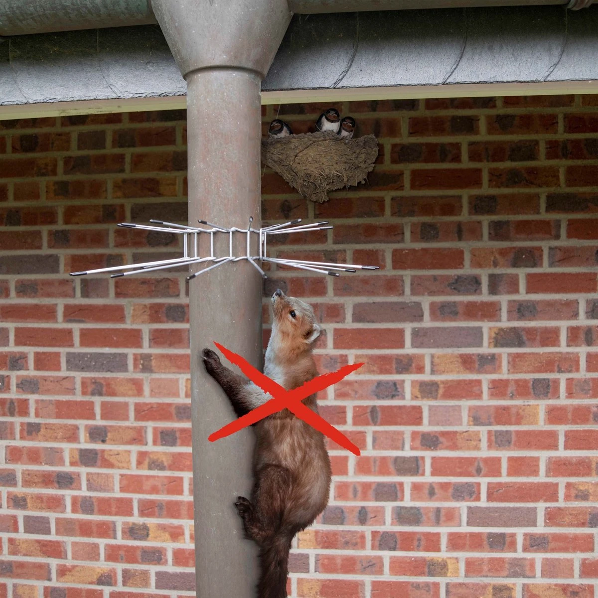 Met zijn lange spikes ziet de regenbuidelriem er weliswaar martiaal uit, maar in principe is hij slechts een klimbarrière die de weg naar boven bemoeilijkt. Bij grotere buisdiameters kan de riem ook met andere sets worden aangevuld.