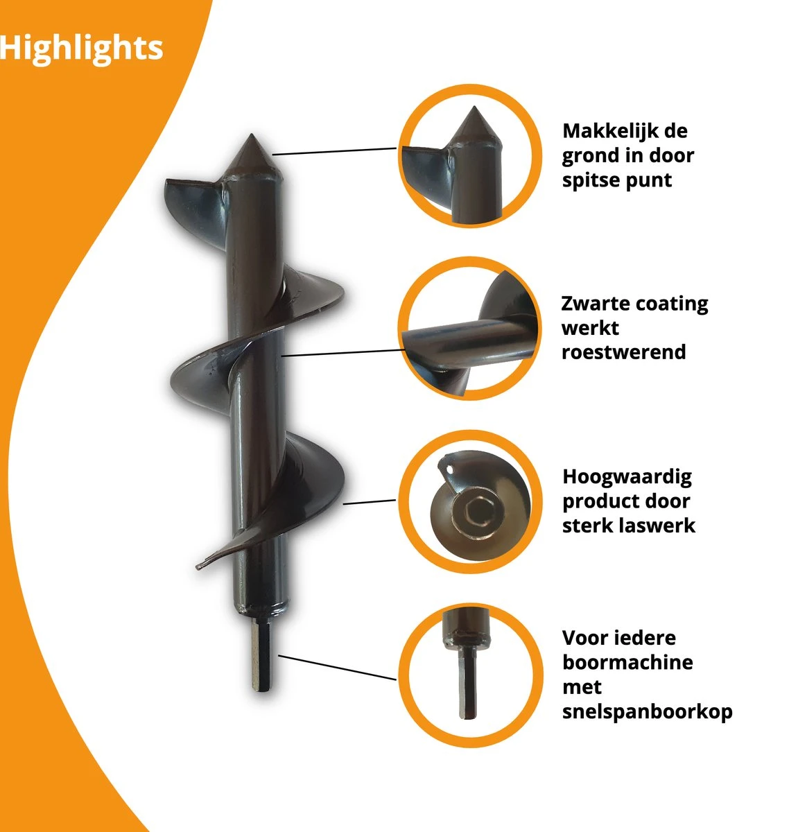 Grondboor kopen? Deze spiraalboor past op bijna iedere boormachine en is snel en eenvoudig te bevestigen door middel van de snelspanboorkop. Te gebruiken als palenboor bijvoorbeeld.