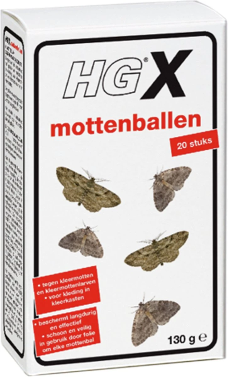 HGX mottenballen zijn een veilige en eenvoudige oplossing om nachtvlinders, mottenlarven en motten te bestrijden. Ze werken lang en effectief en beschermen zo tegen aantasting van kleding. Motten en nachtvlinders voeden zichzelf met kleding, waardoor er gaatjes ontstaan. HGX mottenballen beschermen kleding langdurig en effectief en zijn schoon en veilig in gebruik door de speciale folie. Ze hebben een prettige zeepachtige geur die niet in de kleding gaat zitten. In het doosje zitten 20 stuks.