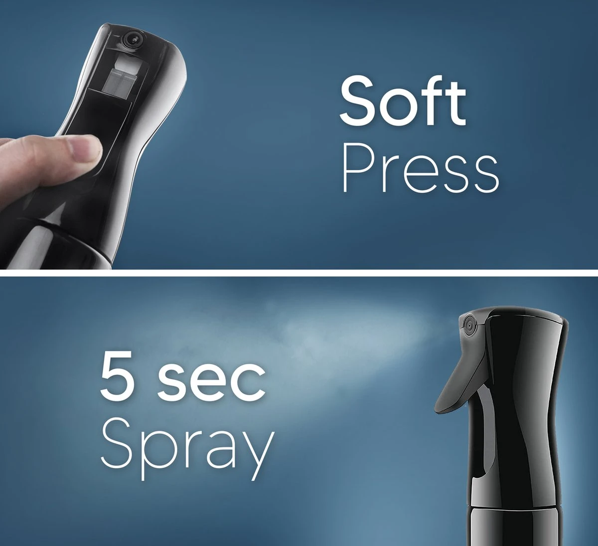 - Lange spray – De 5 seconde lange spray creëert een constante en fijne mist in een perfecte hoeveelheid water om het haar te verzadigen.