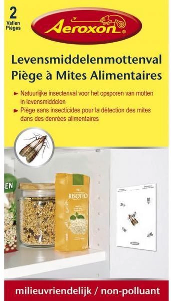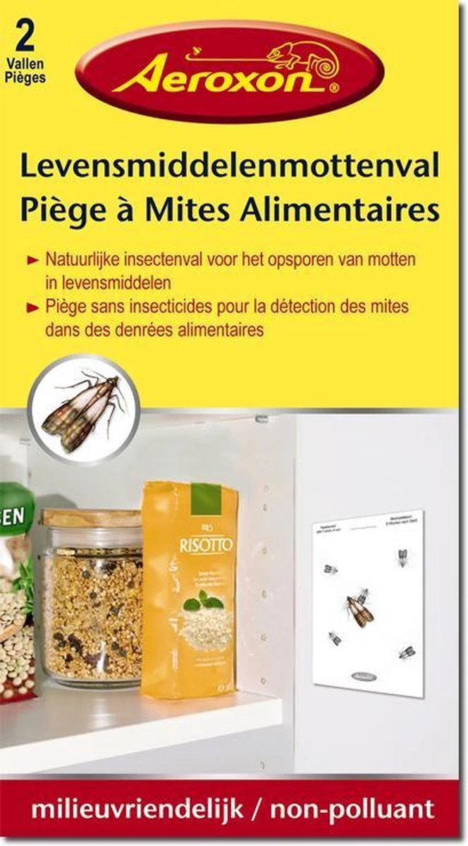 Gifvrije en reukloze vallen met lokstof. Alle gedroogde levensmiddelen zoals, noten, muesli, chocoladeproducten, koekjes, thee, gedroogd fruit, granen, zaden en diervoer kunnen door deze motten worden aangetast. Product heeft een levensduur van 6 weken.