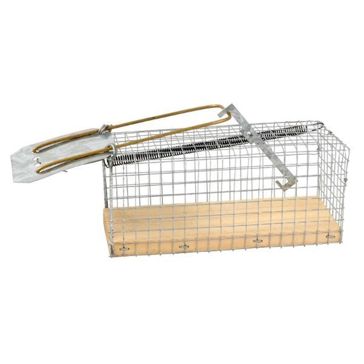 Vangkooi / muizenval voor het vangen van muizen, gemaakt van verzinkt gaas met een houten bodem.