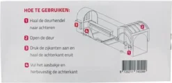 Je zet de muizenval met het grootste gemak. Druk de zijkanten van de val in om de achterkant te openen en vul vervolgens het aasbakje met aas. Plaats de achterkant van de val terug en open de valdeur door de hendel naar achteren te trekken. Dat is alles! De val is klaar voor gebruik. Dankzij het diervriendelijke design is de val niet gevaarlijk voor huisdieren en kinderen.