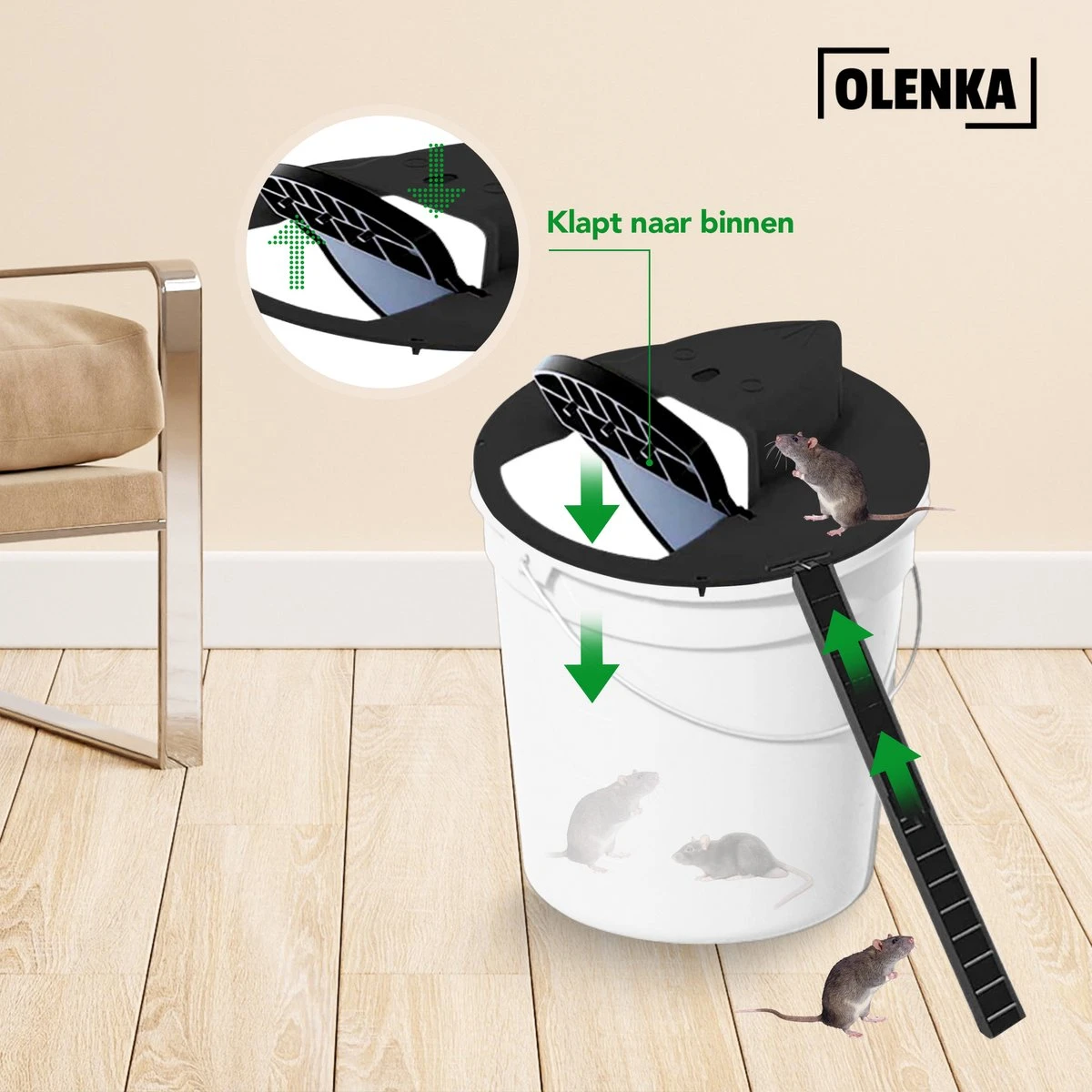 - Inhoud: Emmer, deksel van muizenval, 1 luikje, 1 trapje en 1 instructie