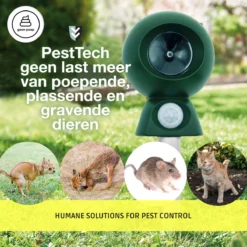 Heb jij ook zo veel last van allerlei verschillende dieren in jouw tuin? Wanneer je een mooie tuin hebt wil je natuurlijk niet dat hier allemaal dieren doorheen lopen en ook hun behoefte in jouw tuin doen… Wij hebben de ideale oplossing! Onze ultrasone kattenverjager is wat jij nodig hebt! Het geluid van de dieren verjager zorgt ervoor dat jouw tuin niet lang meer populair zal zijn bij de dieren in de buurt. Het geluid van de ultrasone dierenverjager gaat niet door muren en schuttingen, dus zal het geen effect hebben op huisdieren binnenshuis of bij de buren. Onze PESTTECH ultrasone dierenverjager is wat u nodig heeft als u geen ongewenste dieren meer in de tuin wilt hebben. Zoals voor alle oplossingen die dierengedrag beïnvloeden kunnen wij niet garanderen dat het in elke situatie effectief is. Desalniettemin reflecteert onze eigen ervaring en de feedback van klanten consequent een uitstekende prestatie en veelzijdigheid. Waar het apparaat te plaatsen: 1. Ultrasone golven in rechte lijnen. Zie het als een gezichtslijn. Stevige voorwerpen hebben een aanzienlijke invloed op de geluidsgolven omdat ze niet door fysieke objecten kunnen gaan. Voor de beste plaatsing, probeer het apparaat te wijzen naar waar de dieren uw tuin binnenkomen, of ten minste zeer vaak betreden gebieden. 2. Het apparaat kan over het gat aan de achterkant van het apparaat worden gehangen of in de grond worden gestoken. Als u het apparaat in de grond plaatst, bevestigt u de grondspies / paal voorzichtig aan het apparaat en duwt u voorzichtig in de grond op de plaats die het meest gunstig lijkt. U kunt altijd verschillende locaties proberen totdat u vindt wat het beste werkt voor uw tuin. 3. Kies bij het selecteren van de installatielocatie elk terrein dat niet wordt gestructureerd tijdens periodes van zware regenval en dat het toestel niet wordt belemmerd. 4. Het is belangrijk om de levensduur van de batterij te maximaliseren door te vermijden dat u op regelmatige tijdstippen op het apparaat richt (zoals een openbaar voetpad). U zult binnen een week verschil gaan zien, en binnen een paar weken zullen zelfs de meest hardnekkige bezoekers wegblijven. Eigenschappen: PIR (passieve infrarood sensor) kan beweging detecteren binnen een straal van 7 meter. Apparaat activeert alleen wanneer de bewegingssensor geactiveerd wordt, zodat de energiebron economisch gebruikt wordt. Is effectief in het verjagen van verschillende soorten dieren zoals katten, honden, ratten, muizen, vossen, vogels, vleermuizen, wasberen. Dekt een boog van 110° en een afstand van 7meter. Het bereikte grondoppervlak is 200m². Neem de Ultrasone Kattenverjager mee tijdens het kamperen en geniet lekker van het kamperen zonder ongewenste dieren in de buurt! Specificaties: Gemaakt van hoge kwaliteit waterdicht ABS plastic. Werkt op zonne-energie en oplaadbare batterijen. Frequentie: 13,5 – 45,5kHz. Bereik binnen een straal van 7 meter. Gewicht: 277 gram. Kleur: groen. Afmetingen: 5CM x 10CM x 13CM.