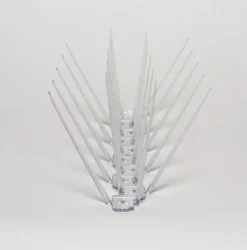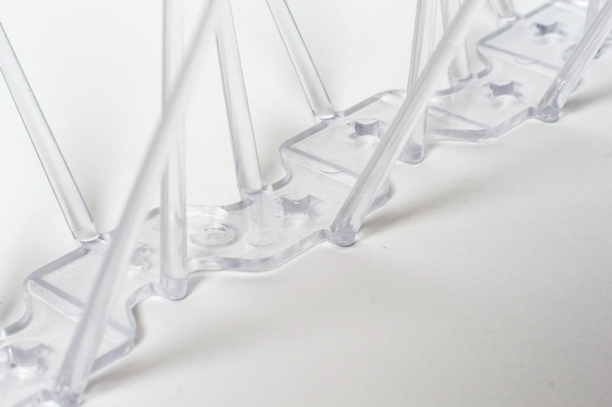 De kunststof duivenpinnen zijn op een 335mm lange strip van polycarbonaat kunststof aangebracht. De afstand tussen de pinnen bedraagt 32mm. Op de transparante en UV bestendige kunststof basisstrip bevinden zich in totaal 20 pinnen. De 110mm lange pinnen hebben aan de bodem een doorsnede van 3 mm en aan de top een doorsnede van 1mm.