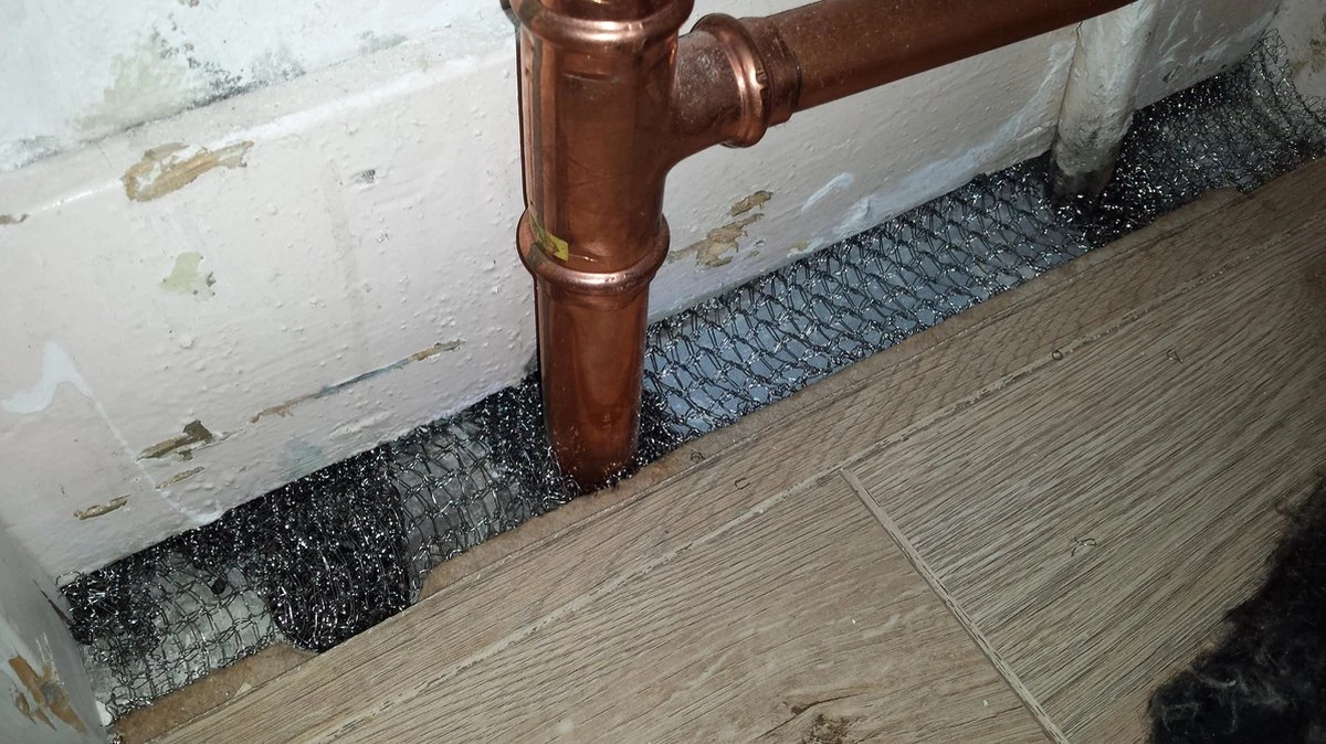 - Rondom leidingdoorvoeren. Ik kom het maar al te vaak tegen dat er behoorlijk wat ruimte zit tussen leidingen en de muur waar ze doorheen gevoerd zijn. Vul de opening rondom op met rvs wering gaas en werk het eventueel weer af met voegenreparatie kit.