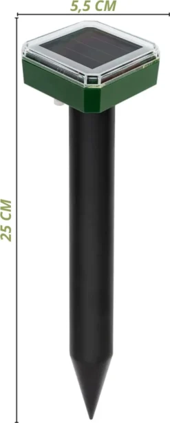 Heb je altijd al lekker in de tuin willen zitten zonder tegen al die molshopen aan te kijken? Dan is deze mollenverjager met ingebouwde zonne panelen de oplossing voor jou. Het apparaat werkt op verschillende frequenties waarbij knaagdieren en andere dieren zoals mollen en muizen een hekel aan hebben. De mollenverjager is omdat het op zonne panelen werkt helemaal draadloos, onderhoudsvrij, waterbestendig en bestand tegen vrijwel alle soorten weersomstandigheden. Het apparaat is diervriendelijk en brengt geen schade toe aan de dieren.