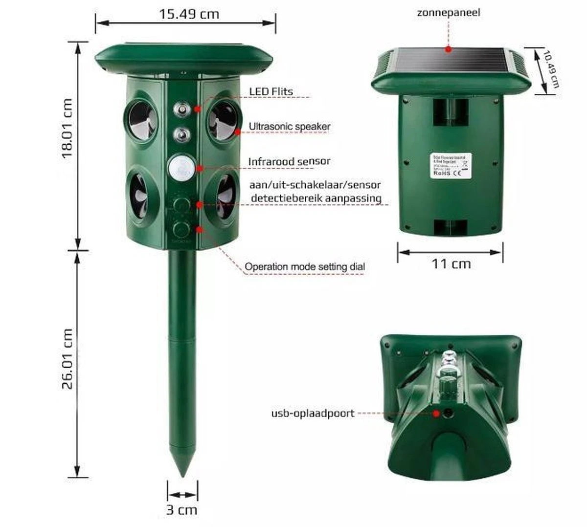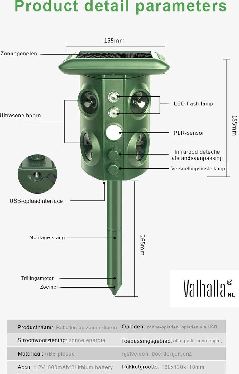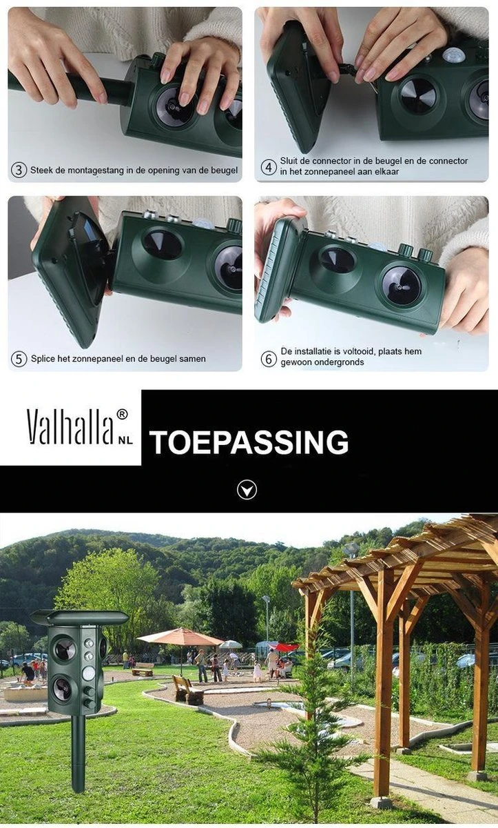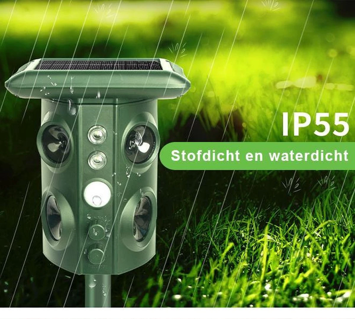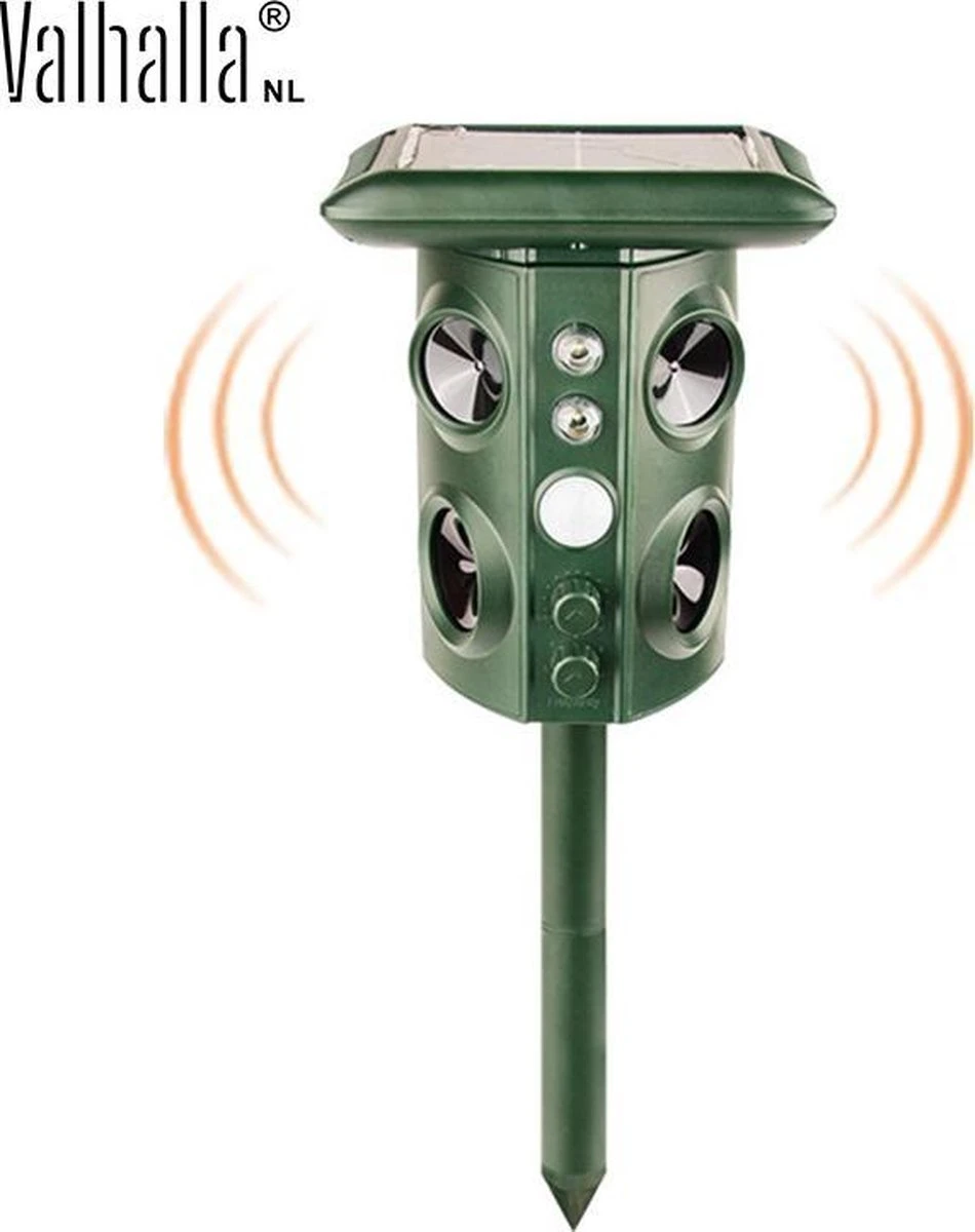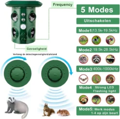 Krachtige door echografie aangedreven dieren. Wanneer het dier het gebied betreedt, wordt een infraroodsensordetector geactiveerd. Het product zendt ultrasone golven uit waardoor het dier zich ongemakkelijk voelt en uit het gebied ontsnapt.