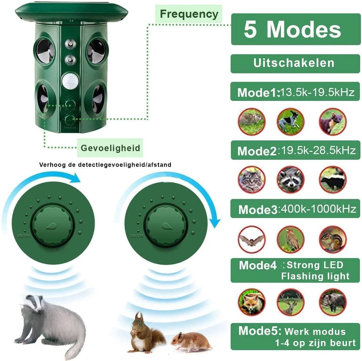 Stand 2: 19.5KHZ-28.5KHZ, het verdrijven van katten, beren, vulling, geur en andere dieren.