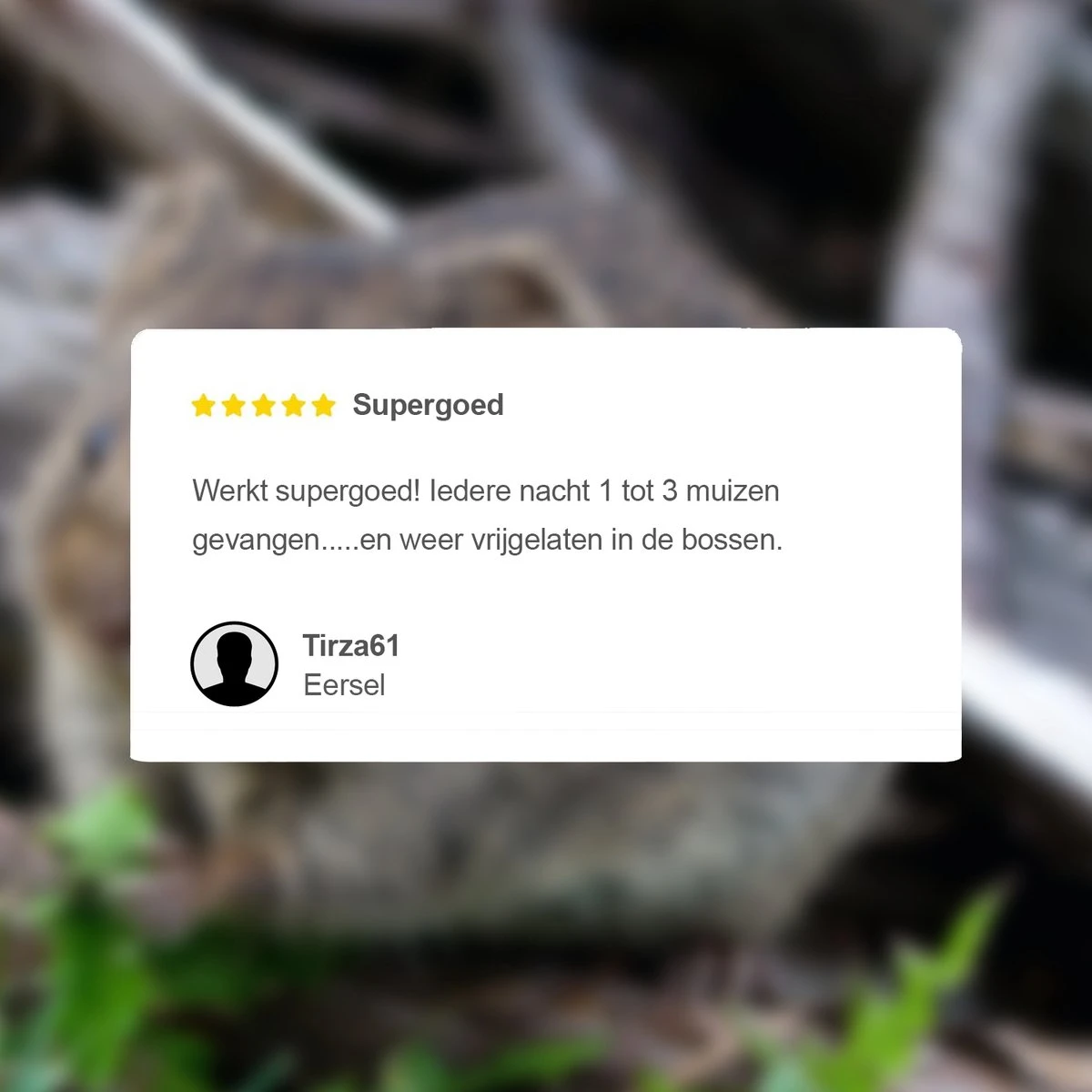 De laatste jaren vangen steeds meer consumenten de muizen levend om ze daarna vrij te laten in de natuur. Dat is mogelijk met deze muizenval. De muis loopt de val in om het voer te eten. Op dat moment gaat de val dicht en zit het knaagdier opgesloten. Dagelijks kijk je of er een muis in de val zit. Als dat zo is laat je hem vrij in de natuur om dierenleed en schade aan de val te voorkomen. Laat het knaagdier vrij op een plaats waar je er geen last van hebt. Het is belangrijk dat dit minimaal 4 kilometer van de plaats van vangst is, zodat de muizen niet terug komen.