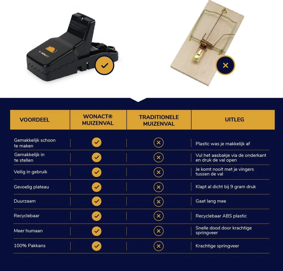 Zelf muizen of kleine ratten bestrijden? Met de Wonact muizenval ben je gegarandeerd snel en voordelig van je probleem af. Het werkt eenvoudig: je vult de aasbakjes, plaatst het gewenste aantal vallen en klapt ze open. De combinatie van het gevoelige plateau en de krachtige springveer zorgt ervoor dat de muizen en ratten op slag dood zijn. Bovendien is deze muizenval duurzaam én recyclebaar. Met een pakkans van maar liefst 100% is de Wonact muizenval de beste keuze voor snelle en efficiënte ongediertebestrijding.